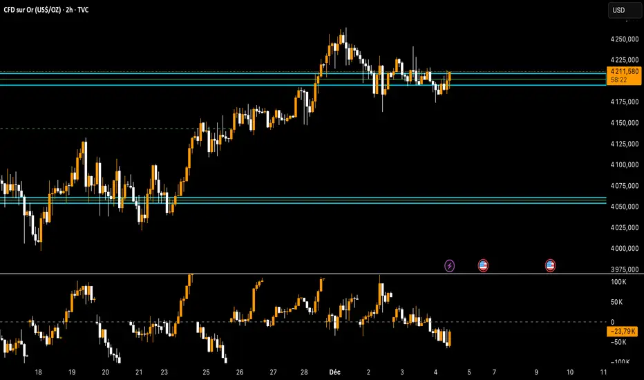 Marché dans une zone de décision clé, coincé entre un bloc de liquidité premium (4208–4214) et un support intermédiaire (4188–4195). On sort d’un mouvement haussier fort (23–27 Nov) suivi d’une distribution légère. Le marché imprime HH, HL puis une série de LH → perte de momentum haussier