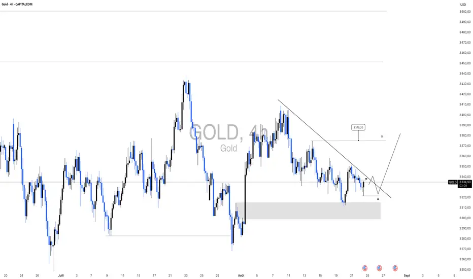 On arrive sur la fin de semaine, et le Gold continue de jouer son rôle préféré : piéger les impatients. Depuis le début du mois d’août, on a vu un marché très orienté haussier, mais rythmé par des retracements profonds destinés à aller chercher la liquidité. Cette semaine n’a pas échappé à la règle : après le rebond post-inflation mardi, on a eu une correction progressive qui nous ramène aujourd’hui dans une zone clé autour de 3330–3320.