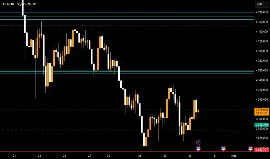 L’or continue d’évoluer dans une phase corrective après la forte impulsion baissière observée fin octobre. Le rebond observé depuis 3890 reste faible et technique, et les acheteurs semblent incapables de reconquérir la zone de polarité 4020 – 4040, qui agit désormais comme une barrière structurelle. Le marché oscille actuellement autour de 3970, formant une consolidation latérale entre 3920 (support) et 4040 (résistance), typique d’une phase de réaccumulation ou de redistribution avant décision macro.