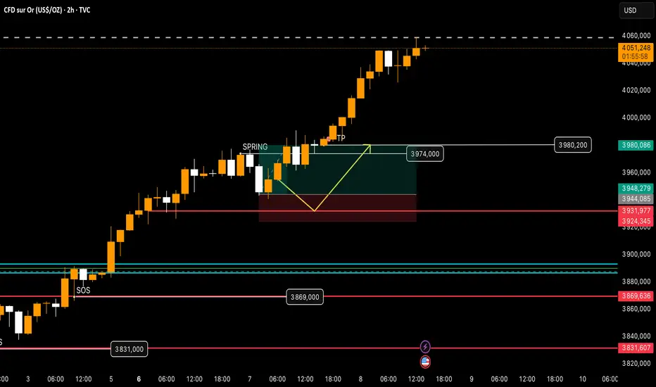 Le prix a fortement rebondi depuis la zone de demande 3640-3655 pour casser la structure baissière et enclencher un rallye haussier puissant. Actuellement, l’or se situe à 3727-3730, proche d’une extension de liquidité. Le momentum reste clairement haussier avec une séquence de bougies impulsives consécutives.