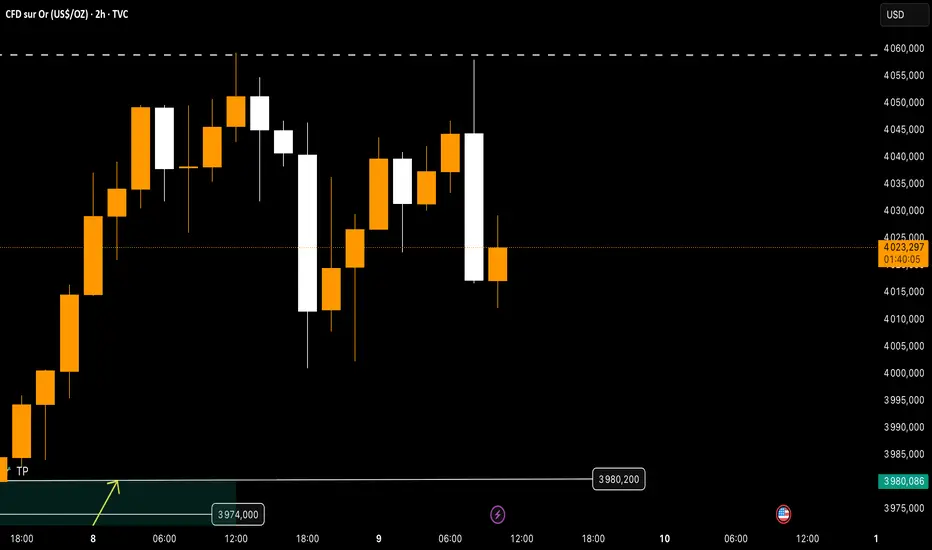 Cette respiration n’invalide pas le biais haussier tant que le support de 3 980 – 3 974 reste défendu. Le marché consolide au-dessus du TP précédent, indiquant une reconstruction de liquidité avant la prochaine impulsion.