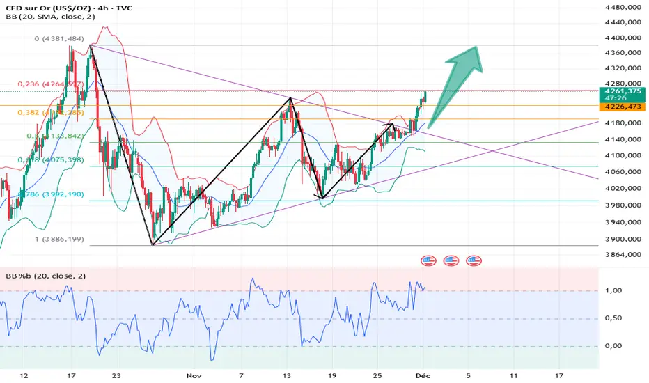 D'après le graphique horaire, l'or a poursuivi sa tendance haussière durant la séance européenne. La figure en chandelier japonais évolue dans un canal ascendant, et les bandes de Bollinger à court terme se resserrent vers le haut. Il convient d'être attentif à une possible consolidation latérale suivie d'un rebond après une correction de l'indicateur. Une résistance se situe autour de 4260 ; un franchissement de ce niveau pourrait entraîner une poursuite de la hausse vers 4300/4330. Les niveaux de support se situent autour de 4230/4222.