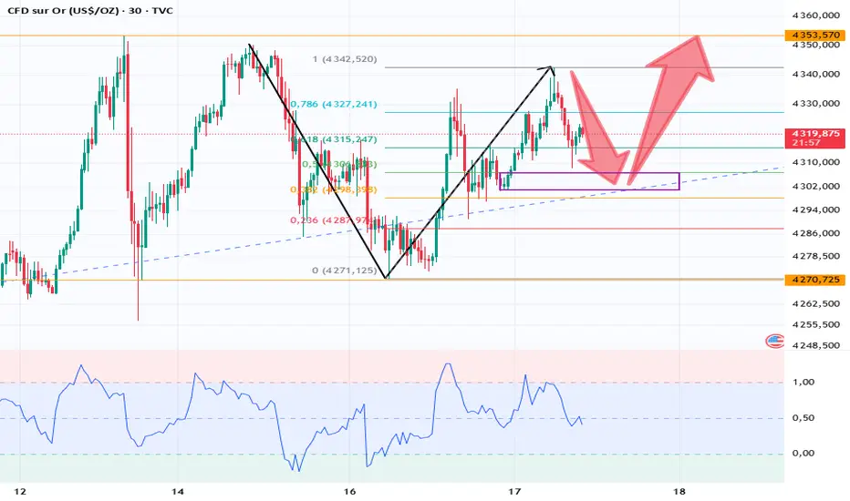 Le graphique journalier de l'or présente un doji, signe d'une forte lutte entre acheteurs et vendeurs. Le cours est soutenu par la moyenne mobile à 5 jours (MA5), orientée à la hausse. Il évolue à l'intérieur d'un canal de Bollinger ascendant. Un support se situe autour du plus bas d'hier, à 4275, tandis que la résistance se trouve à 434,5.