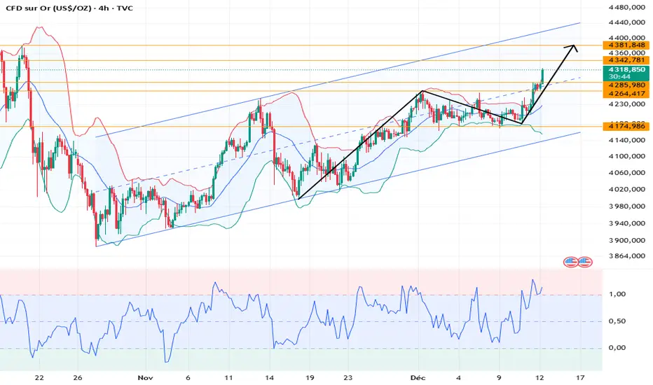 Sur le graphique journalier, l'or affiche une performance solide, avec une tendance haussière continue. Les moyennes mobiles se croisent à la hausse, les niveaux de support remontent progressivement et les bandes de Bollinger s'élargissent. Après cette cassure, une nouvelle phase de hausse est inévitable. Le cours est en progression. Le niveau de support à surveiller aujourd'hui se situe autour de 4265, zone d'inversion des résistances.