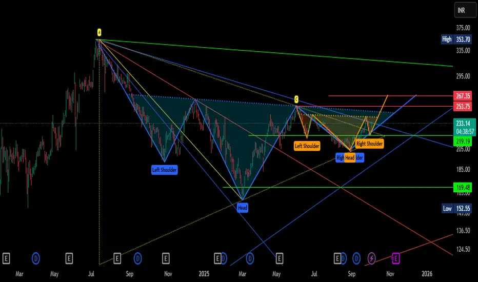 This stock forming 3 patterns 2 is INVERSE HEAD & SHOULDER bigger one is in blue color and other is in orrange color onr more pattern having breakout and having tasted reversed is triangle shown here in yellow color as ABCD .