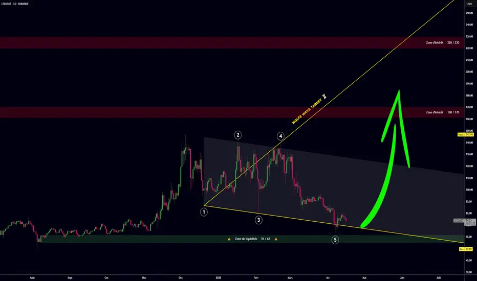 Magnifique vague de Wolfe haussière en formation, mais attention au point 5 qui n'est peut-être pas définitif vu la zone de liquidités (55-62).