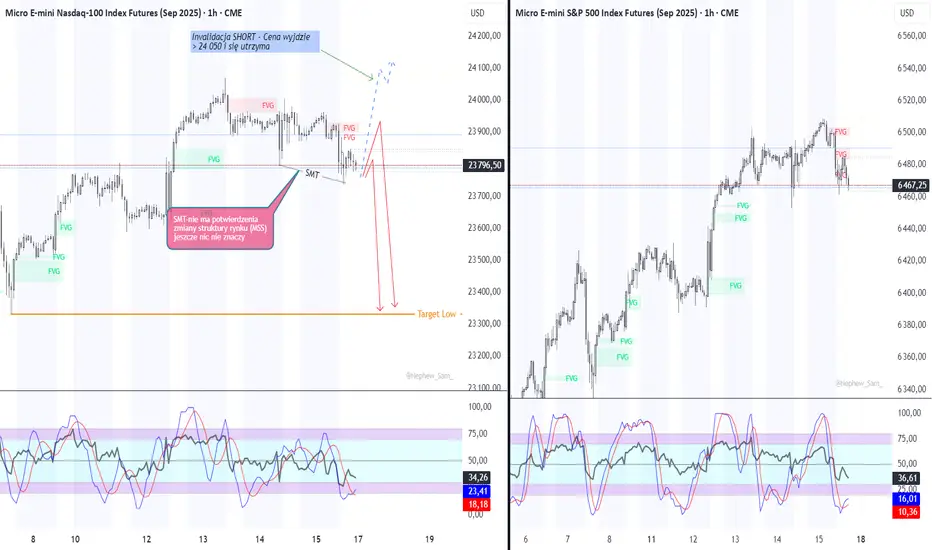 * Początek tygodnia: możliwe odbicie w górę do –FVG (NQ: 23 875–23 920, ES: 6 485–6 500).
