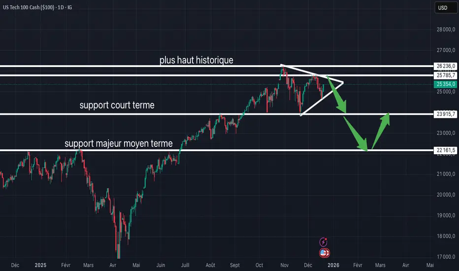 La première zone de vente se situe vers 25800 correspondant à une résistance horizontale + haut de triangle de consolidation.