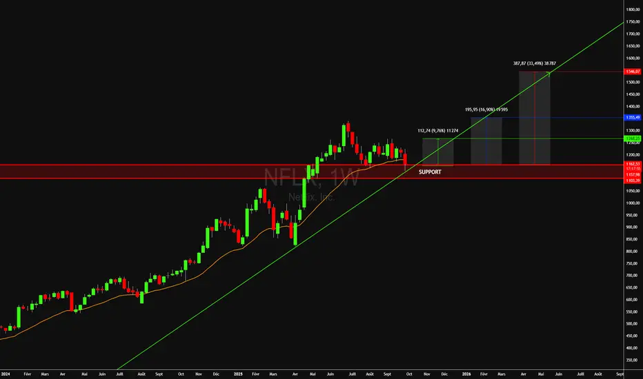 Depuis son sommet du printemps, Netflix a connu une phase de correction lente, étalée sur plusieurs semaines, marquée par une baisse de ≈ 9,7 % depuis juin.