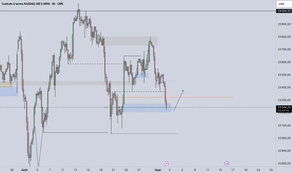 Nous arrivons enfin sur une zone très attendue : le dernier rebalance du range H4 qui n’avait pas encore été mitigé. Le marché a déjà absorbé la liquidité du 26 août ainsi que celle de lundi, et revient désormais travailler les 50% du range, en testant à la fois l’OB H1 et bientôt l’OB H4, offrant une confluence technique de grande importance.