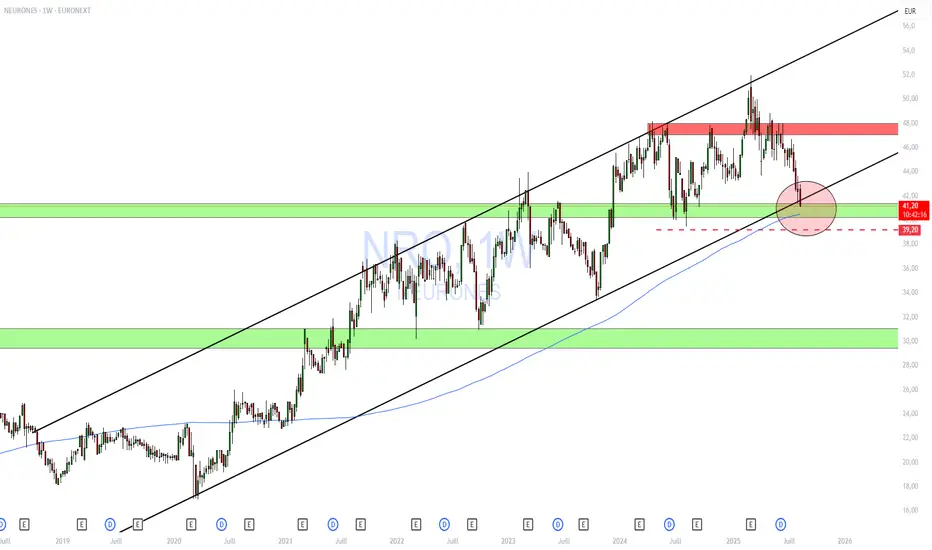 Après plusieurs années de progression dans un canal haussier bien défini, Neurones connaît un coup de frein avec un repli de près de -3 % cette semaine, venant tester la borne basse du canal ainsi qu’un support majeur autour des 41 €.
