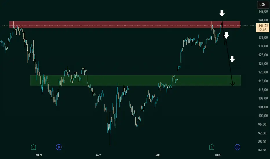 Ce graphique de NVIDIA Corporation (NVDA) daté du 3 juin 2025 montre un scénario d’analyse technique anticipant un retournement baissier potentiel. Les zones colorées et les flèches suggèrent une configuration basée sur les zones d'offre et de demande.