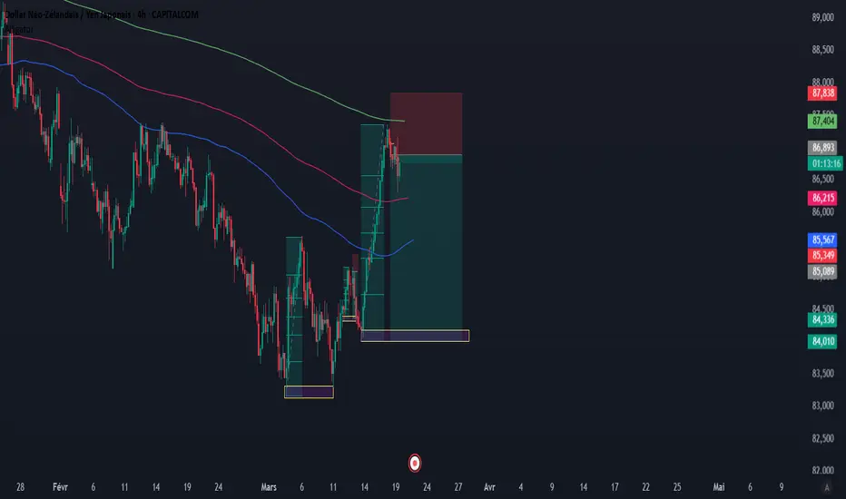 J'ai actuellement décidé de vendre à découvert le NZD/JPY à un prix d'entrée de 86 860, avec un stop loss fixé à 87 840 et un prix cible de 84 190. Je vais vous expliquer mon raisonnement derrière ce choix et l’analyse technique et fondamentale qui a soutenu ma décision.