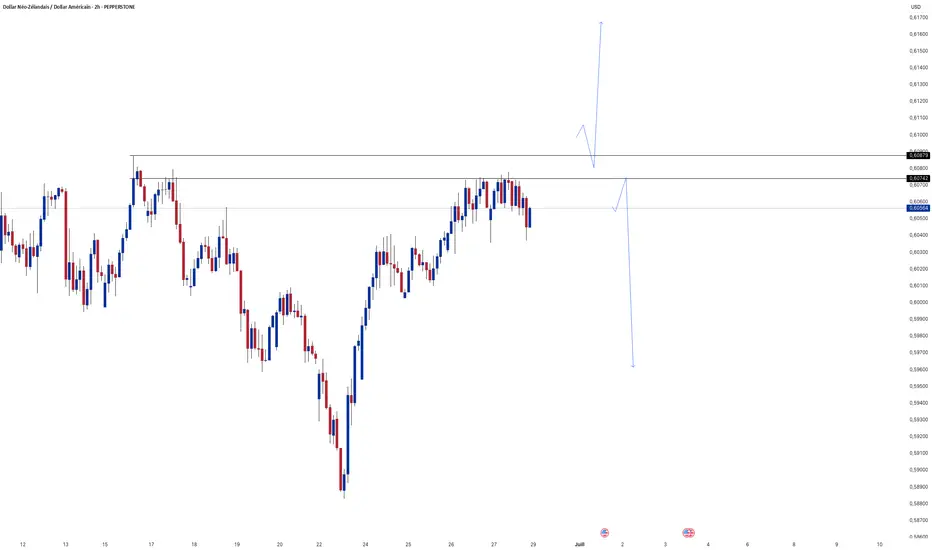 Sur NZDUSD 2H, toute la décision se joue dans la résistance 0,6065-0,6090 : scénario majeur → une cassure franche, suivie d’un léger pull-back sur la zone, propulserait le pair vers le prochain cluster haussier autour de 0,6170. Scénario alternatif → rejet net sous ce plafond ; un retest avorté ouvrirait alors la voie à une correction vers 0,5970-0,5950. Une clôture propre au-dessus de 0,6090 invaliderait le biais baissier, tandis qu’un enfoncement sous 0,6040 confirmerait la reprise de la pression vendeuse.