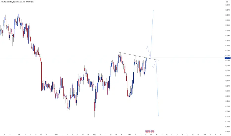 L'analyse sur NZD/USD en 8H met en évidence une résistance oblique qui agit comme un plafond pour les prix. Deux scénarios sont envisagés : une cassure haussière de cette résistance suivie d’un pullback avant une impulsion vers 0.5900 - 0.5960, ou un rejet sous la résistance, entraînant une correction baissière vers 0.5620 - 0.5540. Le comportement du prix autour de cette ligne de tendance sera déterminant pour valider l’un des deux scénarios. Une clôture nette au-dessus confirmerait une poursuite haussière, tandis qu’un rejet marqué favoriserait une reprise baissière.