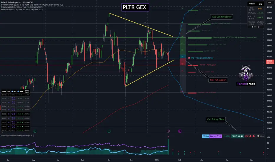 With price, GEX, and volatility all compressing simultaneously, PLTR is setting up for a near-term breakout, with earnings acting as a potential catalyst. Direction will be determined by which side of the GEX range resolves first.
