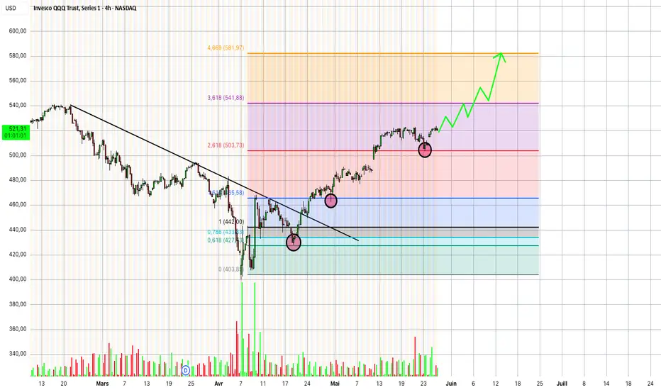 📊 Scénario en cours : Tant que QQQ se maintient au-dessus de la zone de cassure, la probabilité d’un mouvement vers 582 $ reste élevée. Une consolidation intermédiaire est possible, mais la tendance reste résolument haussière.