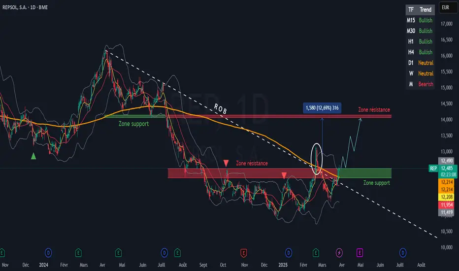 📉 Tendance baissière sous la ROB, avec une première fausse cassure et réintégration le 21 février. (voir ellipse)