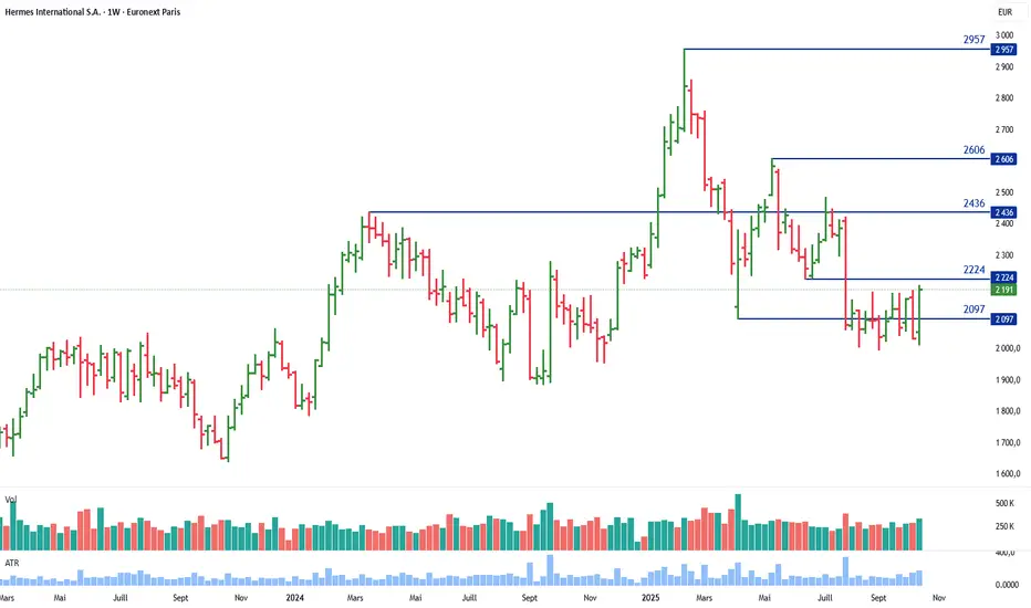 Après plus de trois mois, l’action Hermès (RMS) arrive enfin à rejeter le support à 2097 et avec du volume. C’est un bon signe. Il faudra une clôture au-dessus des 2224 pour confirmer ce rebond et envisager un achat. Les prochains objectifs seraient dans ce cas 2436, 2606 et 2957.