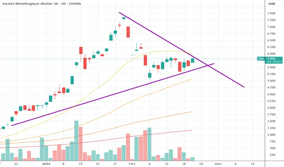 L’action SMI évolue dans une phase latérale de consolidation au sein d’une tendance générale haussière. Le prix forme actuellement un motif technique montrant un resserrement de la volatilité avant la détermination de la direction suivante.