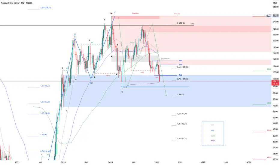 SOL est actuellement sur la dernière zone de support majeure (100–110$ / 0.786 Fib).