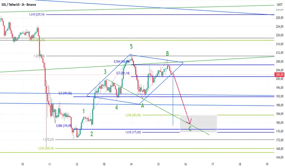 Le graphe SOLANA en horaire présente un diamant baisser potentiel (en bleu), dont l'objectif est au environs de 180$.