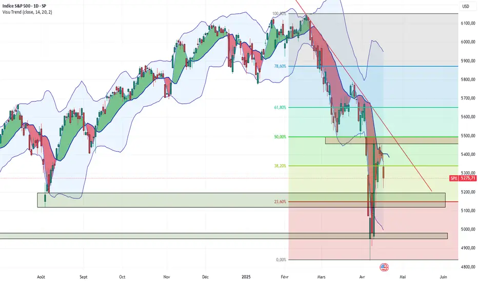 Ensuite techniquement. J'ai positionné les retracements de Fibonacci du début de cette baisse jusqu'au point bas atteint le 07 avril. On remarque immédiatement que le niveau d'équilibre à 50% se situe justement aux alentours des 5500 pts.