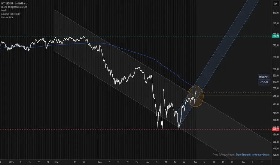 Pour les investisseurs en ETF SP500 en Euro, on assiste à une sortie par le haut du canal baissier long terme, repéré par l’Adaptive Trend Finder (signal de breakout haussier).