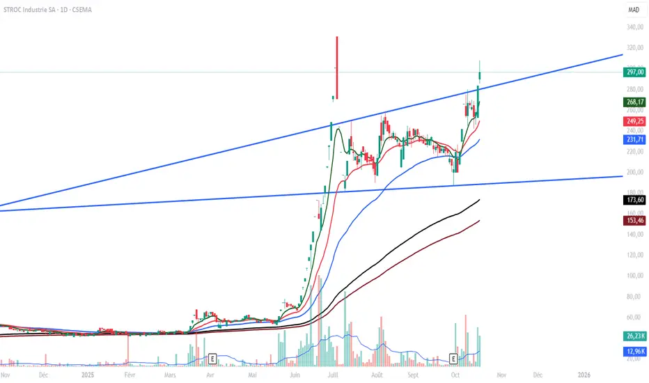 • Breakout majeur du canal ascendant (résistance cassée à 288–292 MAD).