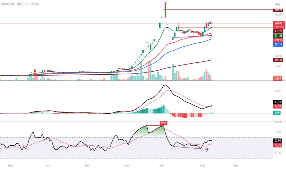 o 231–224 MAD ≈ zone EMA20 + Fibo 38,2 % (223,5) → confluence importante