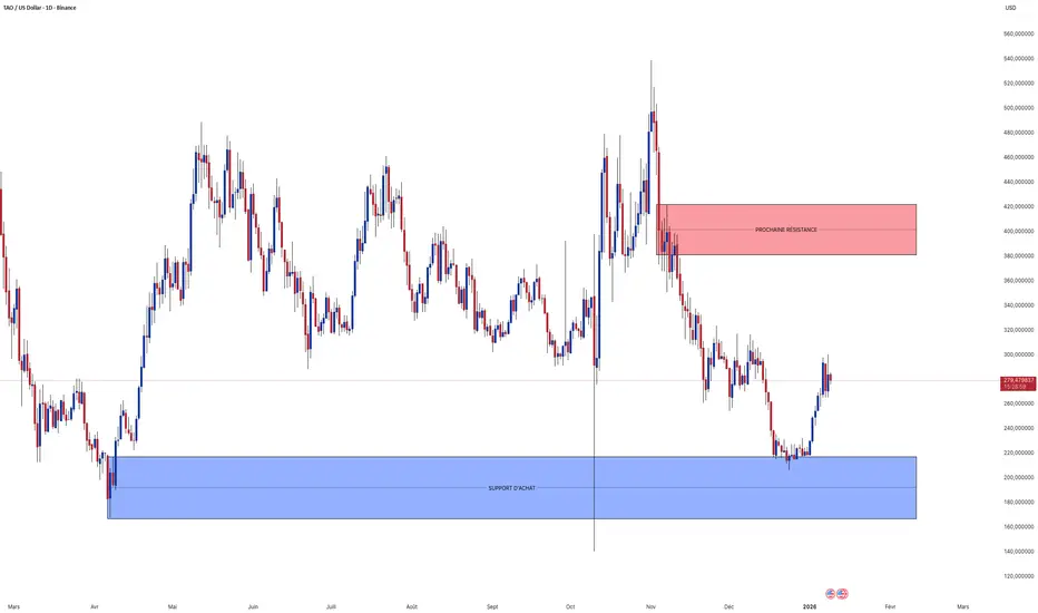 TAO pourrait revenir tester sa zone d'imbalance (FVG) vers 180 $. Ce serait alors une zone de rechargement stratégique.