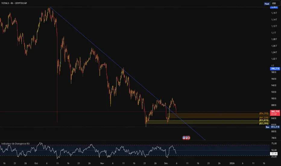Nous voyons actuellement le TOTAL3 arriver sur une zone de possible rebond, nous pourrions spéculer un possible rebond sur les Alts, observons si le 0.618 de Fibo est respecté.