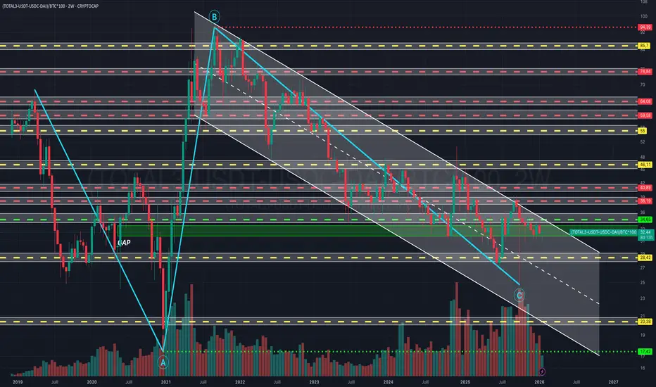 TOTAL3-USDT-USDC-DAI / BTC ×100 – Structure en running flat ABC (2W)