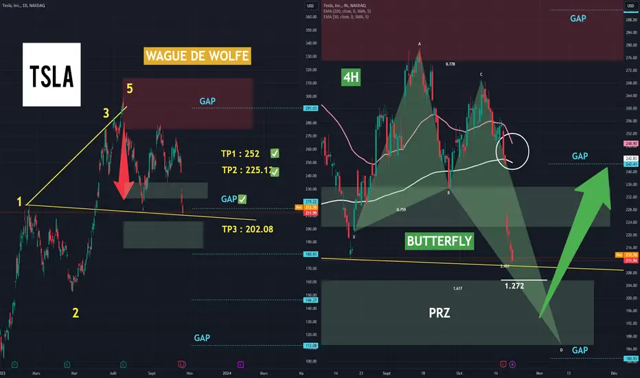 TESLA(4H) : BUTTERFLY détecté : Rebond possible sur les EMA.50 & EMA.200 + GAP ( 242.41),