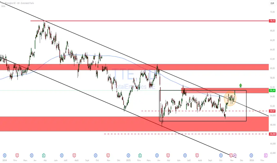 🚧 Résistance majeure : 55-56 € (haut de canal + zone de polarité)