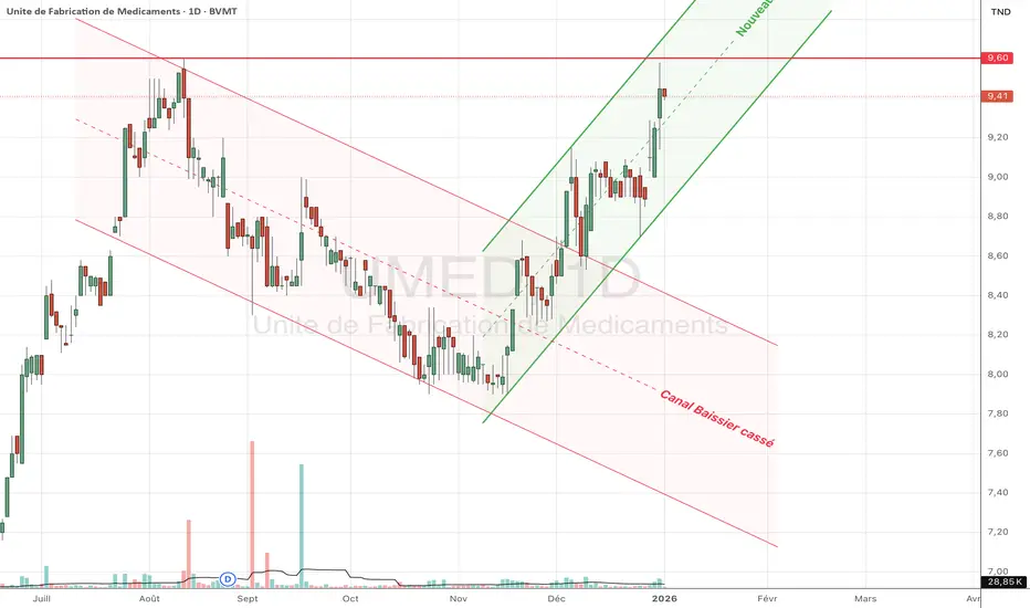 UMED à la bourse de Tunis : Le graphique montre clairement une inversion de polarité majeure. Le titre est passé d'une phase de correction à une phase d'impulsion haussière.