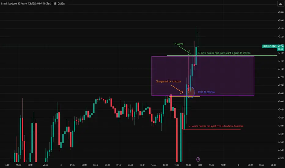 Aujourd’hui sur US30 en M15, un setup haussier sympa pour un trade court