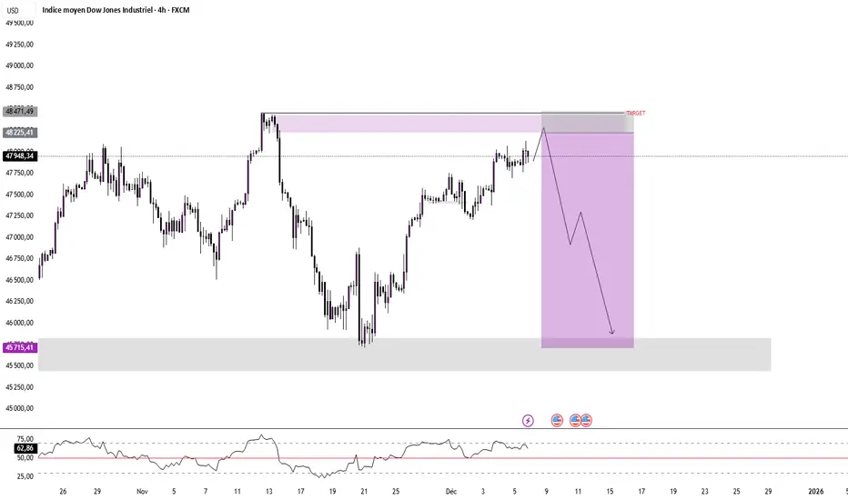 Tant que la zone de distribution n’est pas cassée proprement, le biais reste vendeur à court terme sur US30.