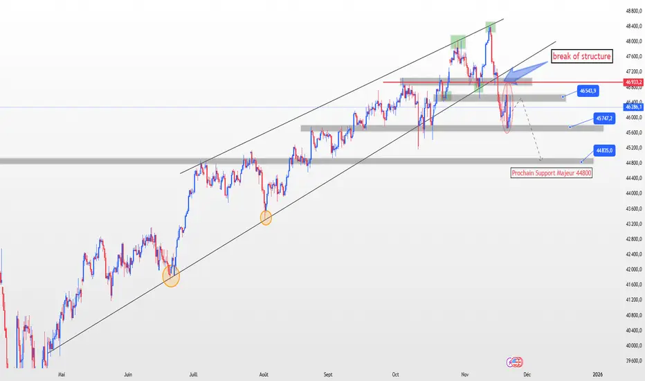 Actuellement à 46286, l'indice évolue dans une zone après avoir formé un double sommet autour de 48000-48400, marqué par le rectangle vert. La flèche bleue illustre la cassure de la structure.