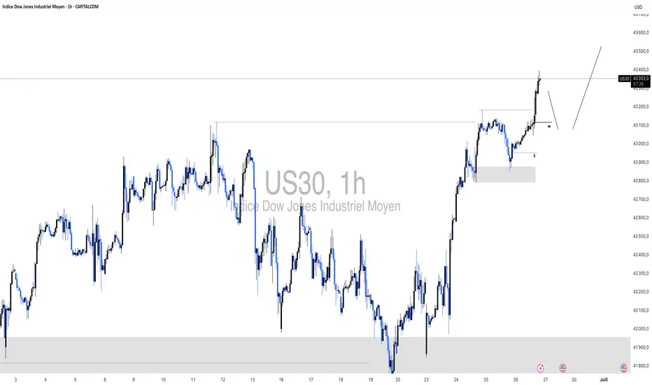 Le Dow Jones évolue actuellement autour de 43 350, dans une zone où la tendance générale reste haussière, mais avec une certaine prudence. La paire a récemment consolidé après une forte progression, et l’on observe des niveaux clés à surveiller pour la suite :