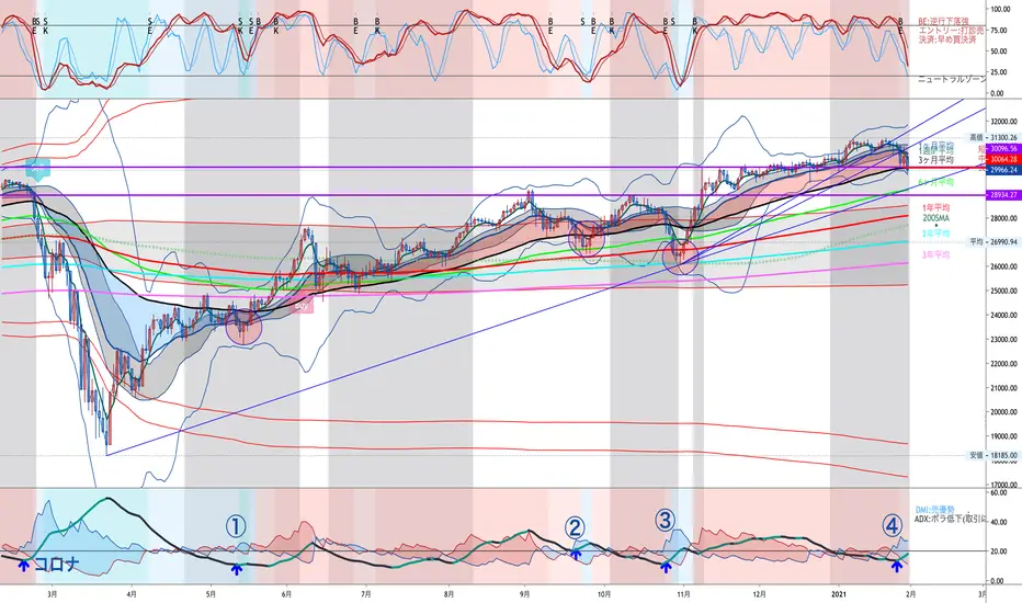 ボラ低下で低位置に落ち込んだADXが上を向き始めた。DMIは売り優勢に数日前から変わっている。