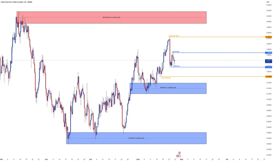 Analyse technique : sous le dernier sommet 1,3925, la paire oscille entre 1,3886 (week high) et 1,3819 (week low) ; un break au-dessus de 1,3886/1,3925 relancerait la hausse vers la résistance 1,3980–1,4040, tandis qu’un rejet avec cassure de 1,3819 ouvrirait une rotation baissière vers le support 1,3750–1,3730, puis 1,3580.