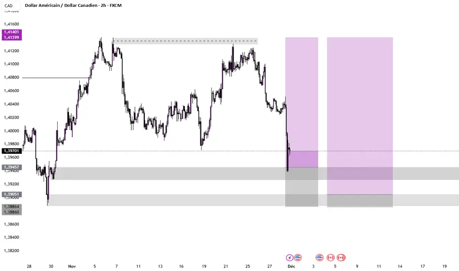 Le résultat est une dynamique macro légèrement défavorable au dollar… ce qui renforce la probabilité de poursuite baissière sur USDCAD — mais l’actif arrive maintenant sur une zone critique de demande, où la liquidité est dense et où les acheteurs ont réagi plusieurs fois par le passé.