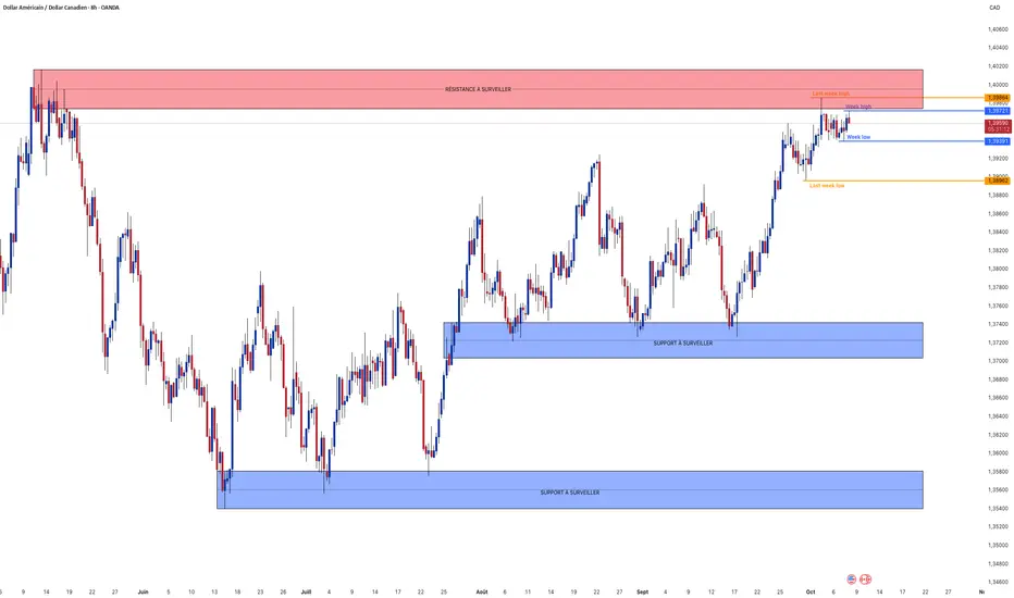 Analyse technique : USDCAD teste une grosse résistance 1,3980–1,4020 : une cassure/closing au-dessus du week high relancerait la hausse vers 1,4050–1,4100, tandis qu’un rejet sous 1,3940–1,3910 exposerait un repli vers le support 1,3750 puis 1,3560.