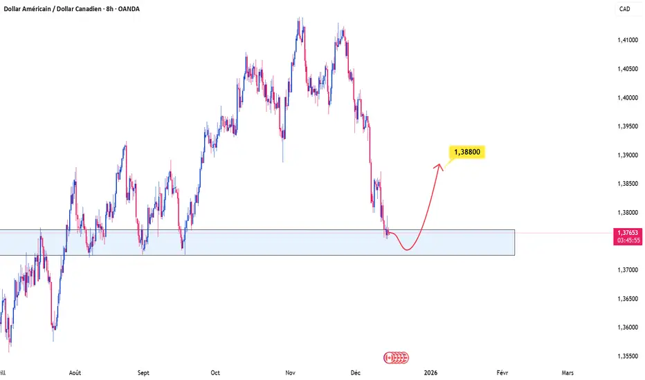 USDCAD vient de connaître une forte baisse, portée par un momentum baissier très puissant. Cette pression vendeuse ne correspond pas à une simple correction, la structure précédente a été rompue, ce qui indique un changement clair dans le contrôle du marché.