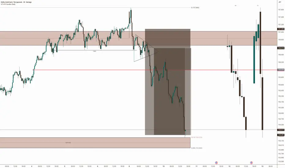 Le trade a été initié suite à l'identification d'un essoufflement de la tendance haussière H4 sous la résistance majeure des 156.800. En unité de temps M30, cette zone a provoqué une phase de distribution, marquant une rupture du momentum immédiat (CHoCH local). La logique reposait sur l'exploitation d'une baisse corrective visant à combler les déséquilibres (FVG) laissés lors de l'ascension précédente, tout en anticipant un retour du prix vers une zone de demande plus profonde.
