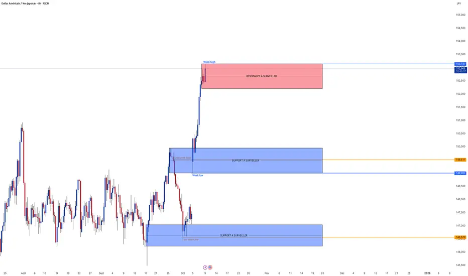 Analyse technique : USDJPY arrive sur la résistance 152,8–153,2 (week high) : une cassure validée au-dessus ouvrirait 154–155, tandis qu’un rejet ici pourrait ramener le prix vers le support 151,0 puis 149,5/149,0, avec extension possible vers 146,6.