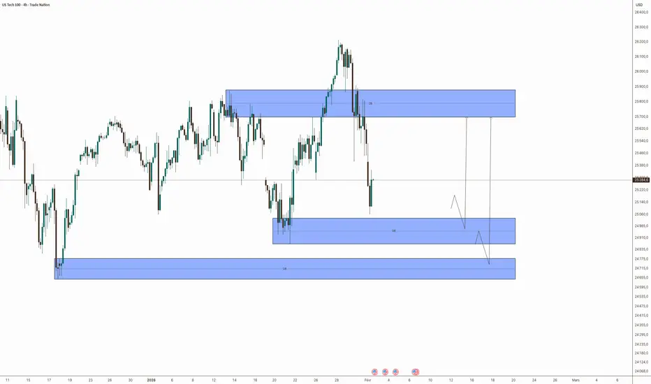 Le bulldozer technologique (US100) subit une respiration nécessaire ce lundi. Après avoir été secoué en fin de semaine dernière par la chute brutale de Microsoft (-11% post-résultats), l'indice cherche désormais un point d'appui pour relancer son moteur haussier. Comme vous l'anticipez, les zones des 25,000 et 24,700 sont les deux "remparts" où les institutionnels attendent de re-charger leurs positions longues.