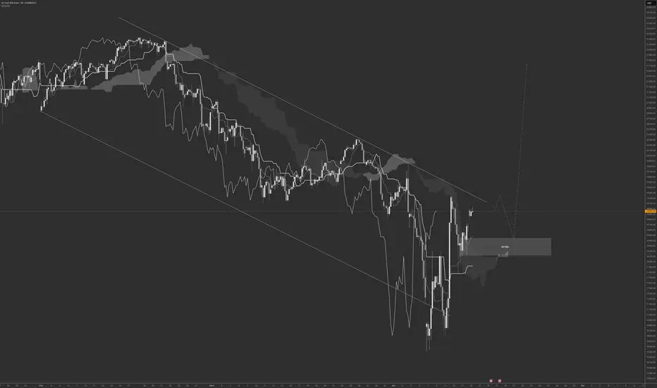 Le Nasdaq évolue actuellement dans une configuration baissière bien structurée, avec un canal baissier visible sur les unités de temps intermédiaires. Toutefois, le comportement du prix montre une tentative progressive de rejet à la hausse, notamment en direction de la zone de résistance clé située entre 19 300 et 19 500 points. Cette zone représente un point de convergence technique important où un retournement baissier pourrait s’opérer, mais également un potentiel point de cassure du haut du canal baissier. Si le prix parvient à franchir cette borne supérieure de manière claire et soutenue, cela constituerait un signal de retournement majeur, marquant potentiellement la fin de la correction actuelle. Ce scénario de cassure haussière constitue donc la première étape à surveiller rigoureusement cette semaine, car il déterminera la suite des événements sur cet indice.