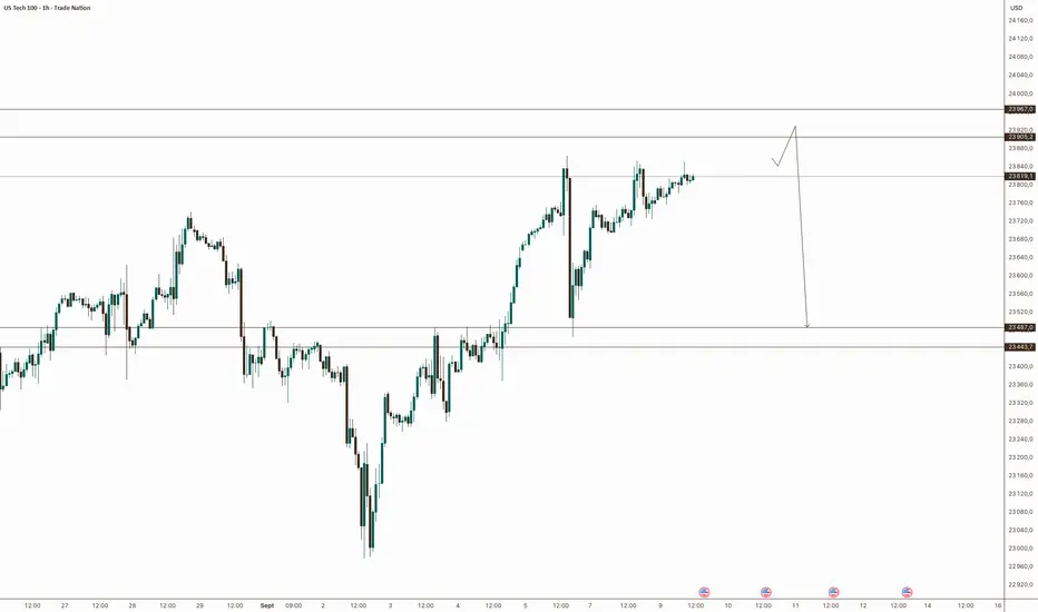 Contexte. Après une impulsion haussière depuis les creux de début septembre, le prix cote vers 23 817,9 (en-tête du graphe) et consolide juste sous une zone d’offre 23 902 – 23 967 matérialisée par tes deux résistances. En bas, on a un bloc de liquidité/support autour de 23 487,0 puis 23 443,7.